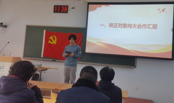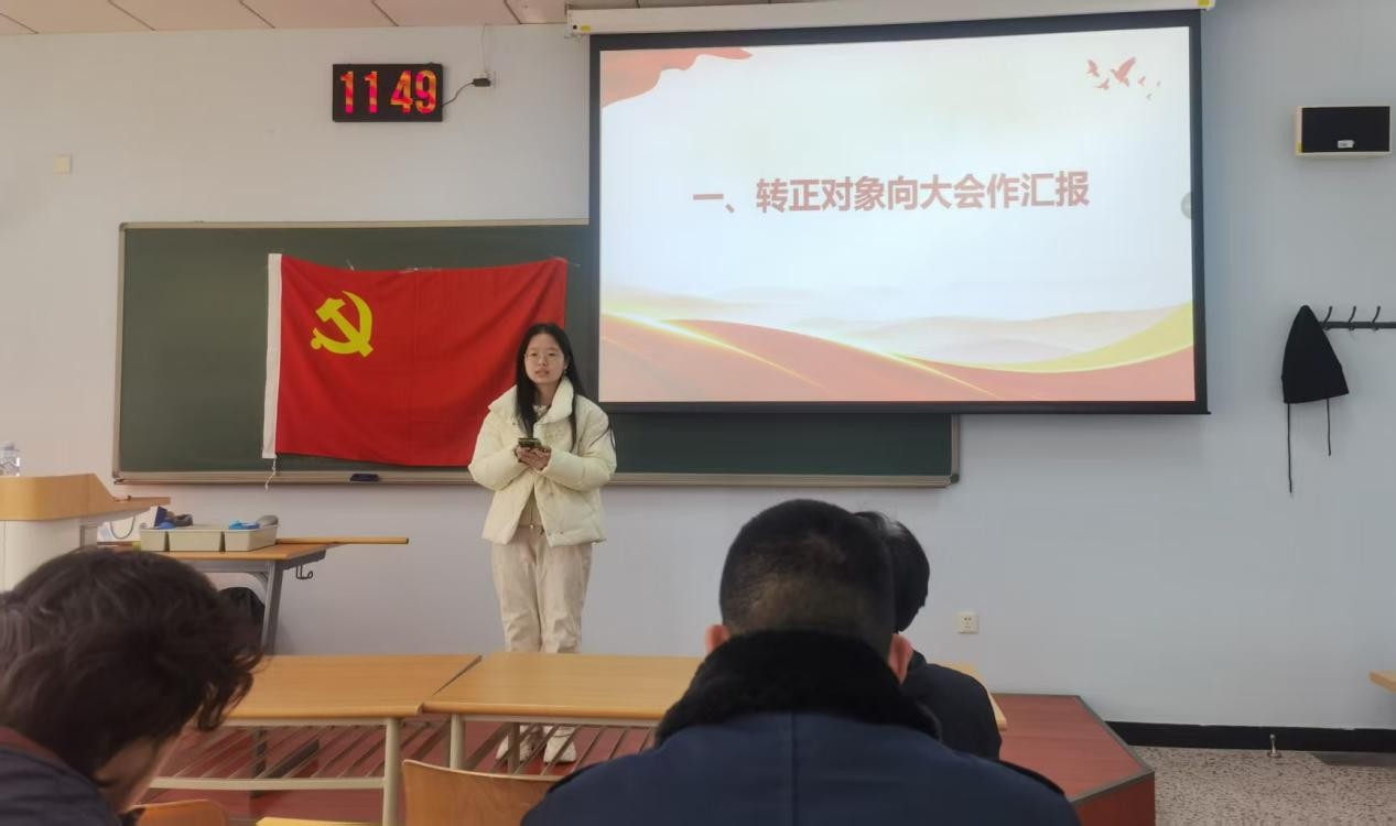 2026年1月4日中午11时30分,天文学院2025级学生党支部在雁栖湖校区教1-123教室召开预备党员转正大会。会议由支部书记蒋畅之主持,宣传委员聂云燕做会议记录。大会应到会有选举权的正式党员24名,因事因病请假5人,实际到会19名。物理天文核学院党委委员朴云松同志列席本次大会。