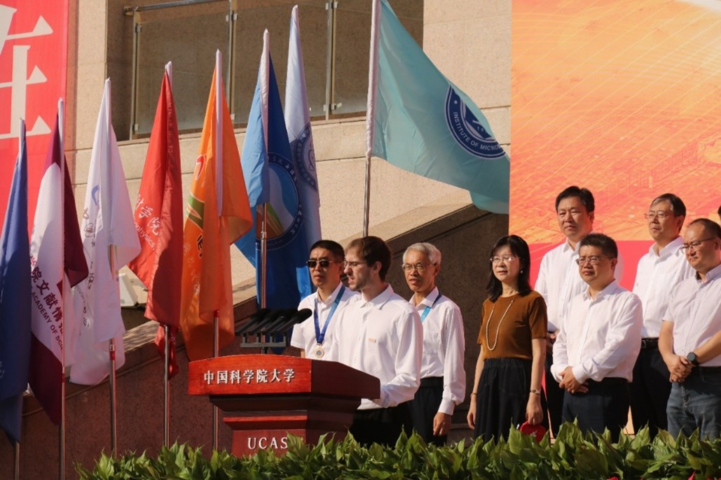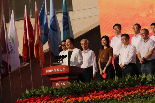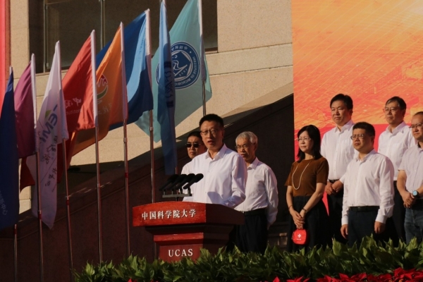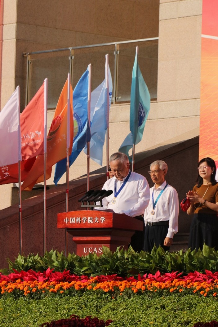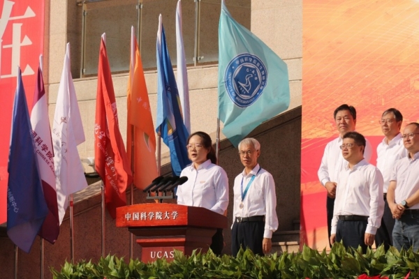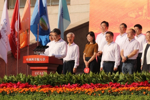 周琪校长首先发表题为“铭记历史 开创未来”的致辞。他以“金秋送爽,叠翠鎏金”开篇,欢迎两万一千余名新同学加入国科大大家庭。周琪校长回顾了中国科学院七十年来在科教融合的育人传统,以及国科大正在探索的自主人才培养模式,并特别强调国科大作为新中国研究生教育开拓者的使命与担当。以60年前人造卫星研制和人工合成牛胰岛素为例,讲述了钱学森、赵九章等老一辈科学家科技报国的精神。以50年前中德马普合作协议为例,强调国际交流与合作的重要性。他勉励同学们“勇于创新、开放合作”,走前人未走之路,解决国家重大命题,努力成为“重大理念的提出者、行业生态的创造者、攻坚克难的表率”。