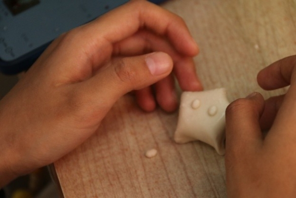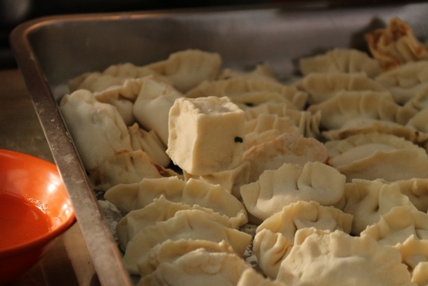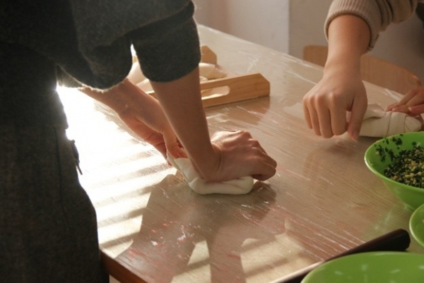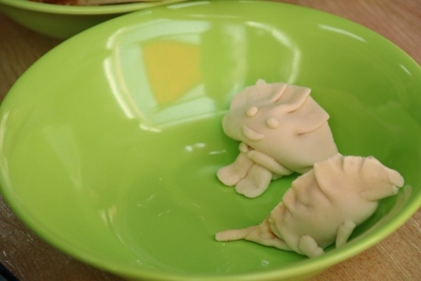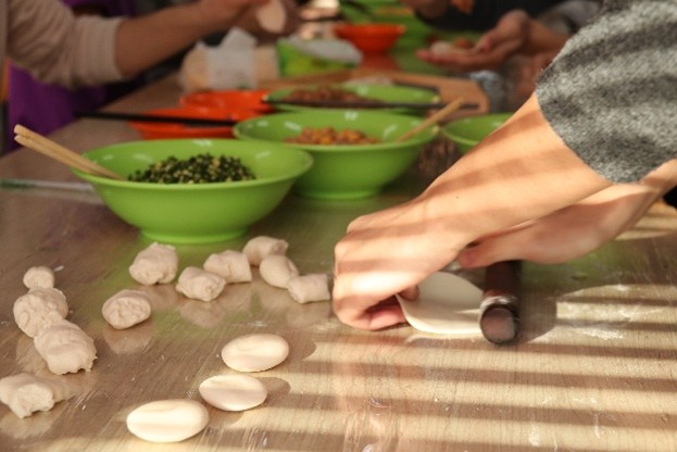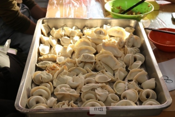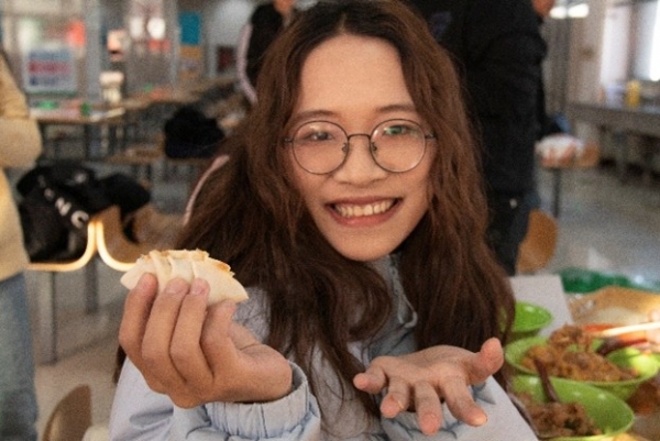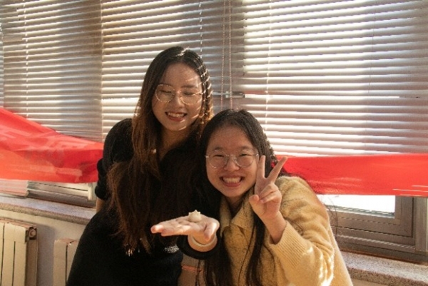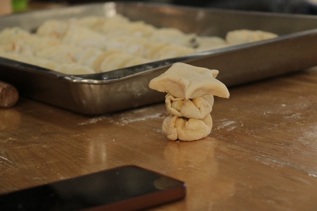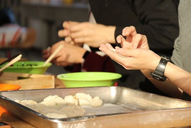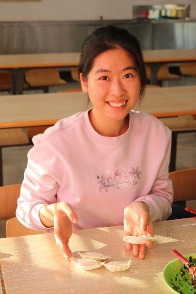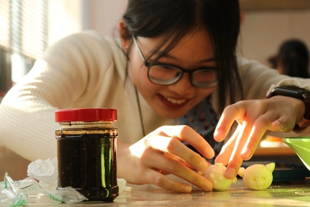 随即,大家按小组围坐在一起,兴致盎然地包起饺子。为方便操作,食堂贴心地准备了现成的饺子皮,帮助饺子快速成型;同时也备好了面团,供大家揉捏擀皮,大展身手。阳光透过百叶窗照射进来,落在一双双巧手上,手中雪白的面团、翻飞的擀面杖、渐次成型的饺子与之一齐构成专属于同学们此刻的冬日韵律。同学们注入巧思,将饺子创造出了各种花样:寓意圆满富足的元宝、天文学子“奔赴”的星星、简洁的立方体……还有同学制作出自己的“本体”形象,十分生动可爱。在这充满生活气息的劳动中,大家充分感受着传统手艺所承载的温情与智慧。