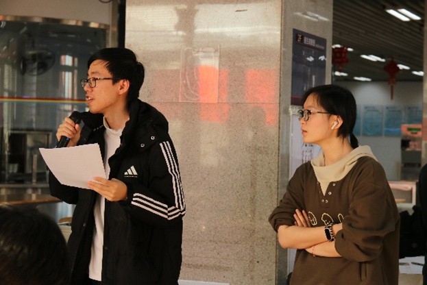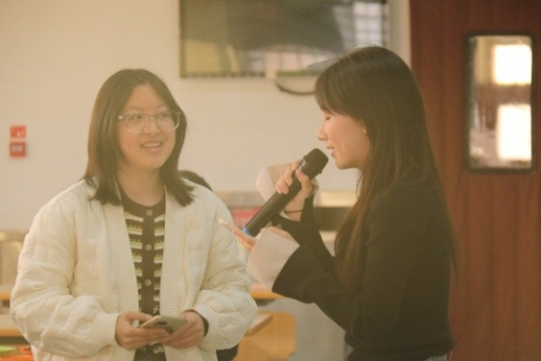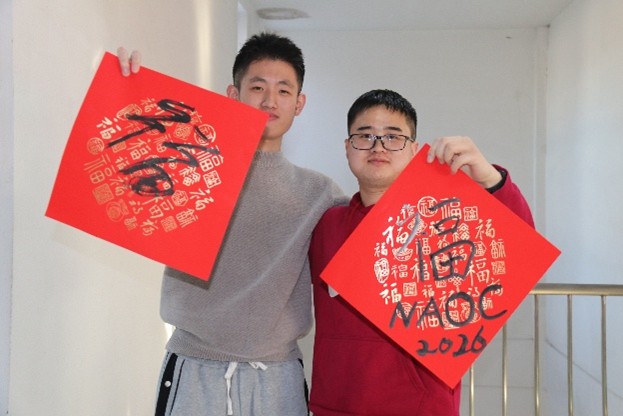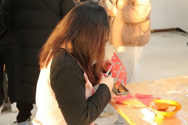 在制作饺子的同时,主持人带领大家进行了紧张刺激的小游戏。同学们在成语接龙中展现丰厚的文化积淀,在首字母造词中比拼即兴创意的火花,在冬至知识抢答中积累有趣的节气常识,更有才华横溢者为大家表演节目,将现场气氛推向高潮。在等待饺子出锅的间隙,同学们凝神静气、提笔挥春,写下一幅幅气韵生动的“福”字;或拿起红纸银剪,将玲珑窗花绽放在指尖,更为冬日增添一抹融融暖意。此刻,缕缕墨香交织着剪纸的细碎声响,传统的年节艺术在指尖重新苏醒、鲜活流淌。