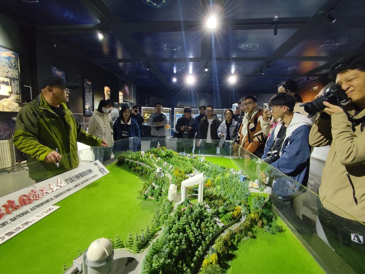 3月21日下午13:20,同学们在中心楼展厅集合,由此展开了充实的参观之旅。驻站老师首先结合地图,系统介绍了我国“四台三站一中心”的天文台址分布。随后,大家通过兴隆基地的全景沙盘,直观了解到基地选址于群山之巅的地理优势:云量较少、大气相对稳定,为高质量的天文观测提供了优越条件。