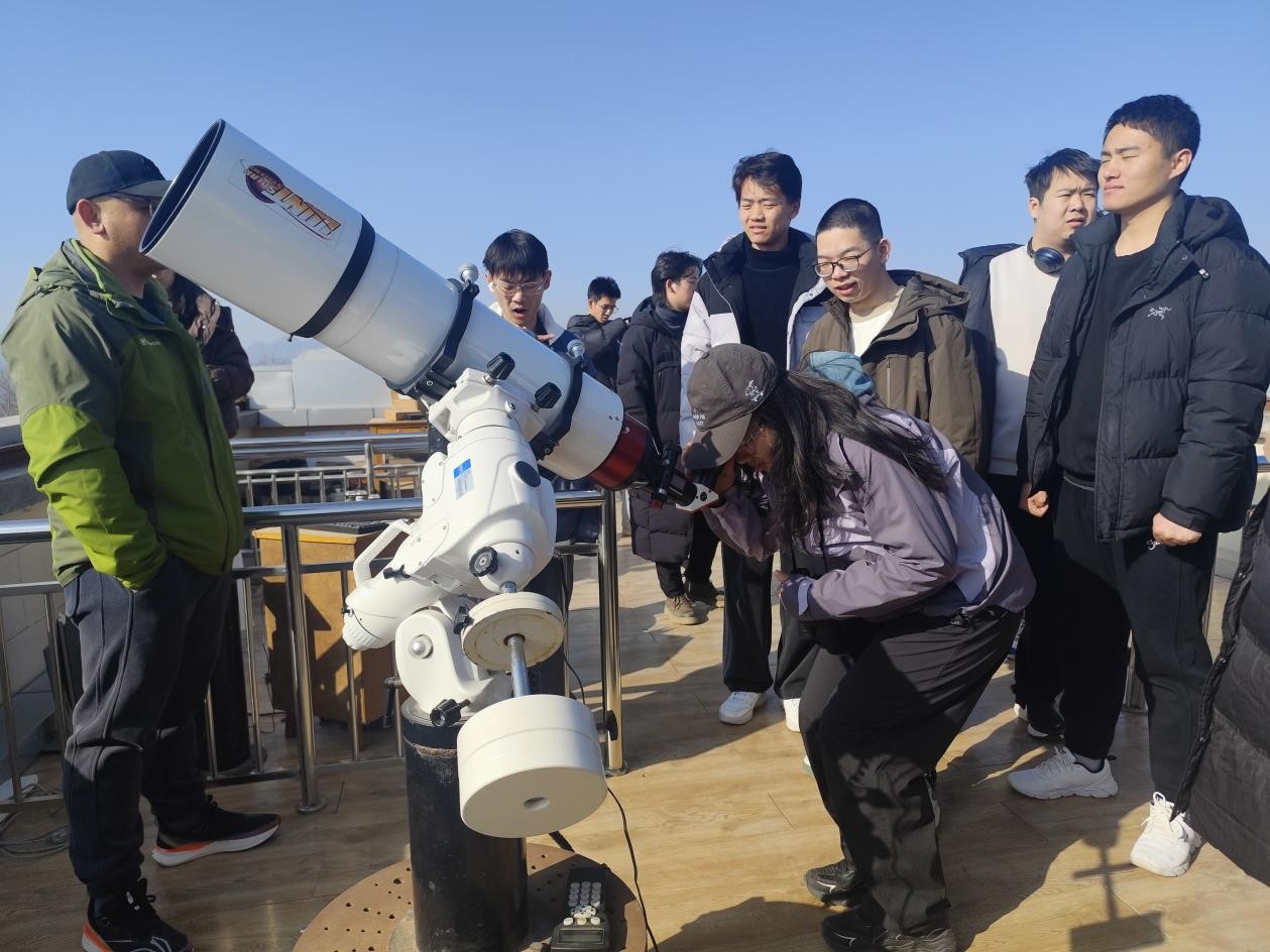 3月22日上午09:00,天空放晴。驻站老师带领大家来到公共天文台进行太阳观测。通过配置了滤光系统的α-H波段太阳望远镜,同学们不仅清晰地看到了太阳表面分布的黑子,还幸运地观测到了日面边缘正在喷发的巨大日珥——一团腾跃在太阳边缘的高温等离子体,景象壮丽震撼。