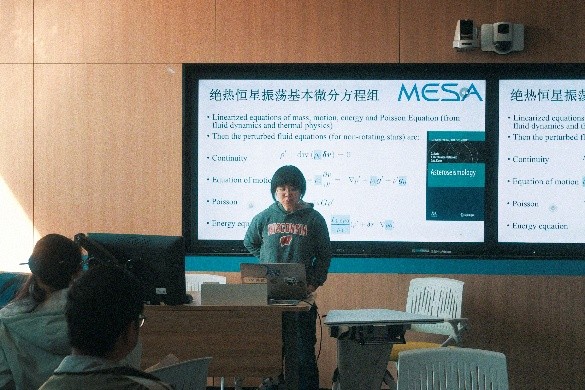 首先,孙萌老师从专业的角度向大家讲解了恒星内部物理的有关知识。老师首先从星震分析的概念入手,引出绝热恒星震荡的基本微分方程组,随后给出结论:星震到潮汐的关系相当于自由振荡到受迫阻尼振荡的关系,即潮汐问题本质上是一个带源项的振荡问题。在理清恒星震荡的基本概念后,孙老师更加深入地为大家介绍了潮汐领域的前沿内容,并列举了高偏心率系统中的心跳星的例子,对科学过程的生动描述尤其给同学们留下深刻印象。